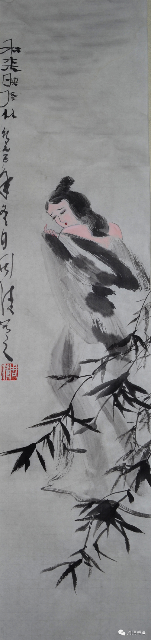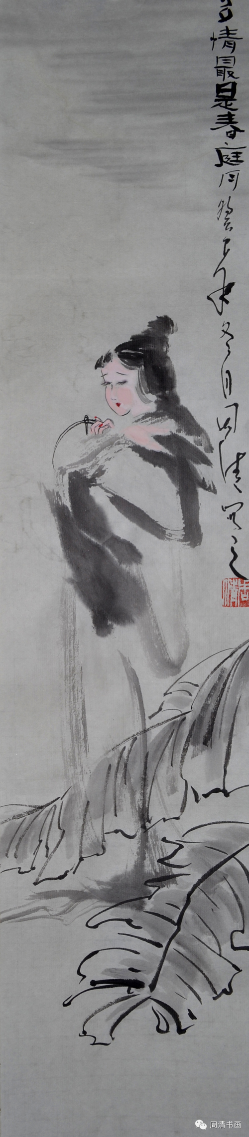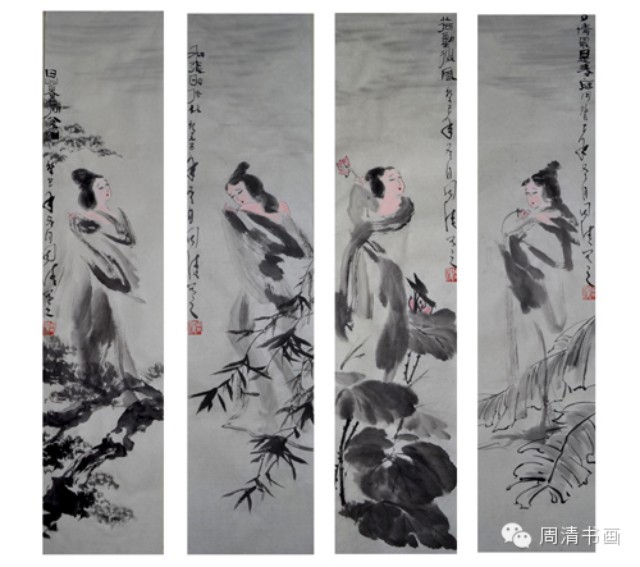 中国书画艺术由魏晋而至现当代,渊源千余年,历代名家灿若星汉,历代名画片纸万金。我们来欣赏下周清老师的新派仕女图,这些女子虽未簪花,但却娴静自若不失风雅,她们薄如蝉翼的披帛襦裙在月下更为娇艳、仪态万方,移步回眸之间仿佛有满怀心事,却只是散怀于廊下庭前,任时光如水漫漶。画中加上松,梅,荷,芭蕉这些元素,大胆又创新,相互呼应得那么相得益彰,惟妙惟肖。